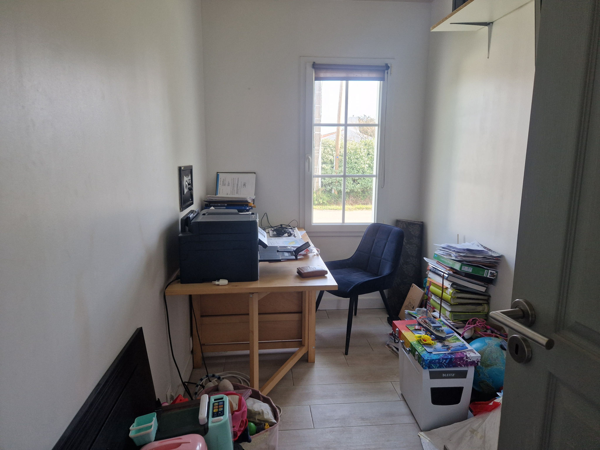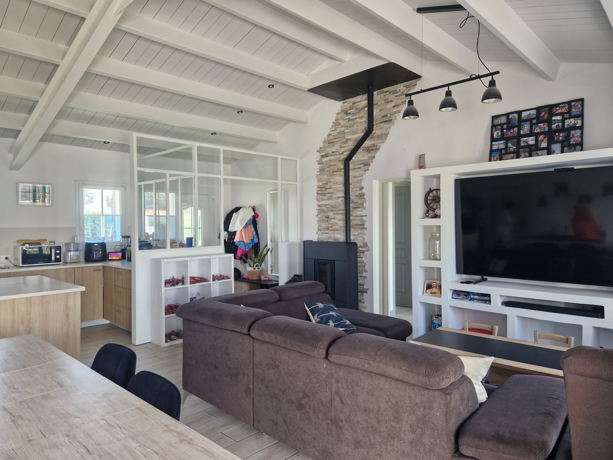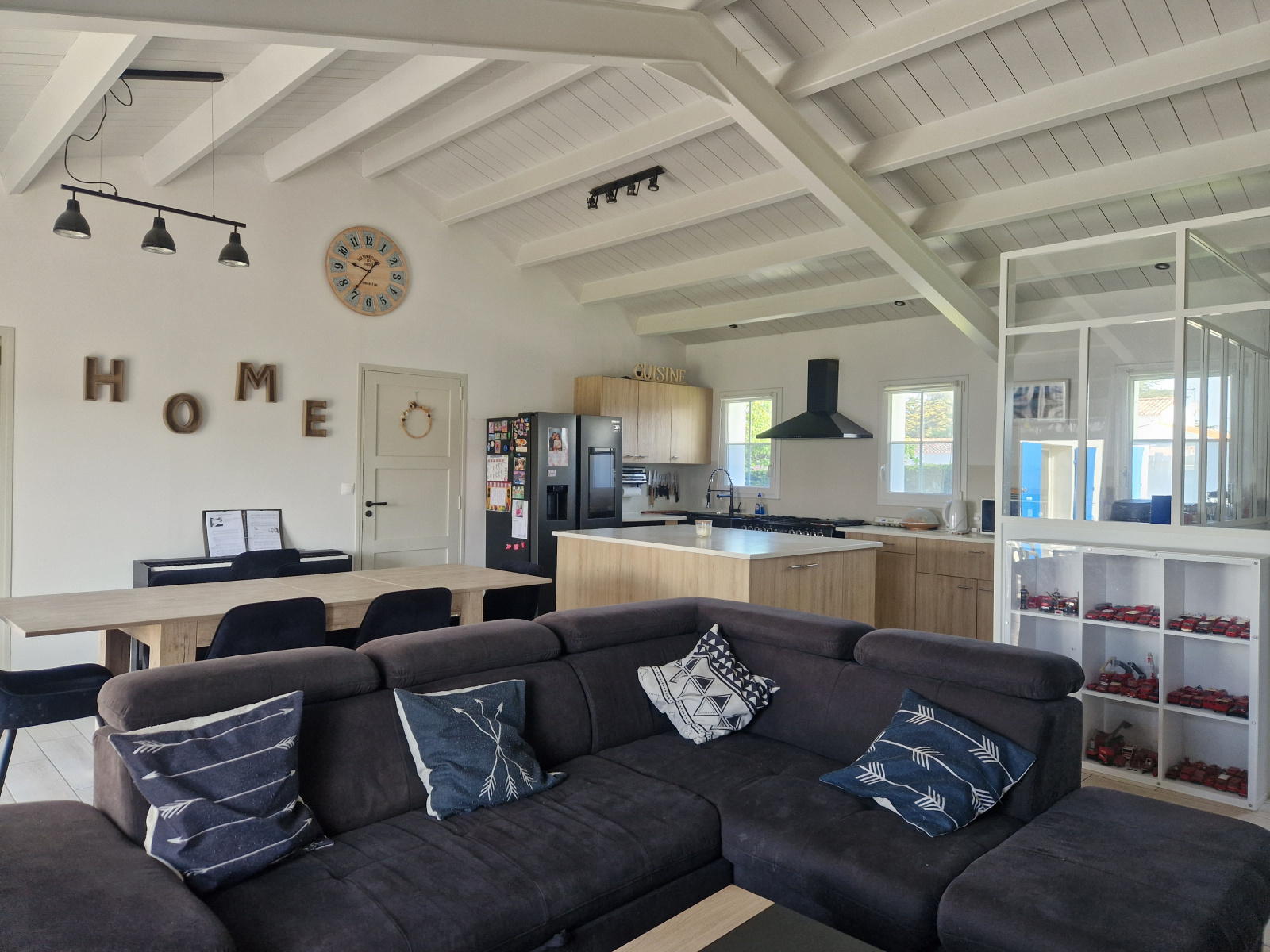 Belle pièce de vie avec cuisine aménagée, ilot central dissimulant une cave à vin, un couloir desservant 2 chambres, bureau, salle de bains et W.C. et buanderie.