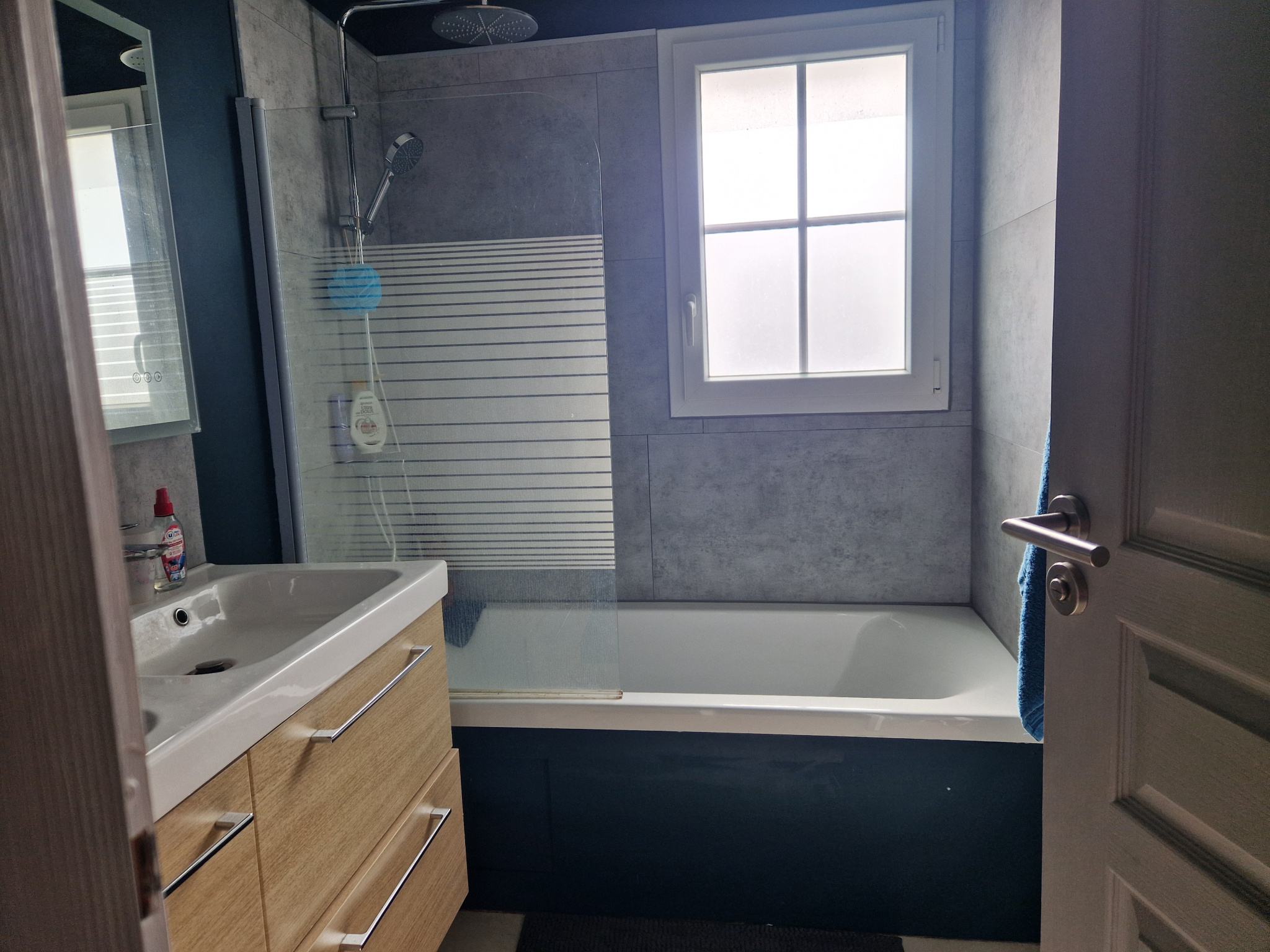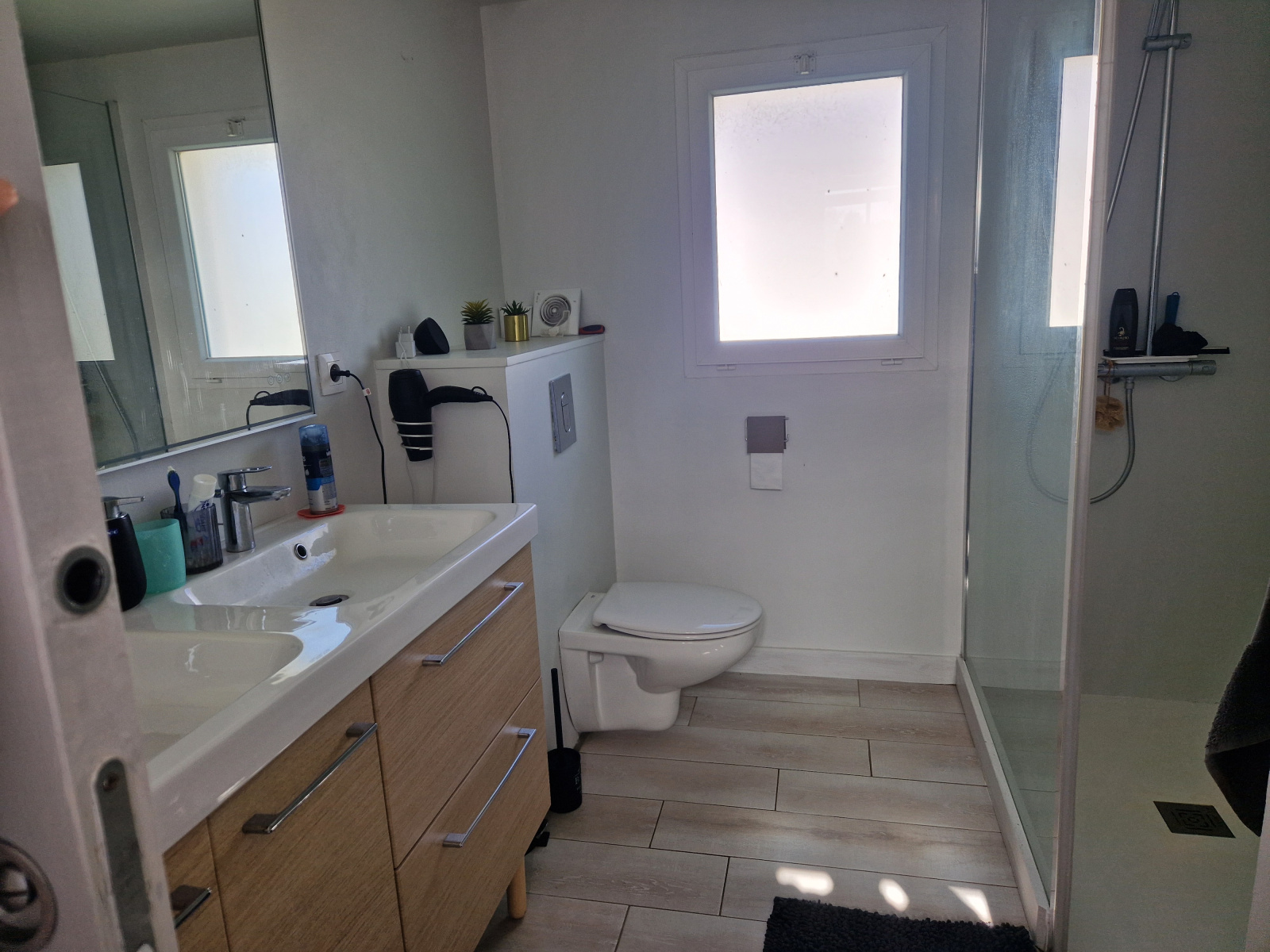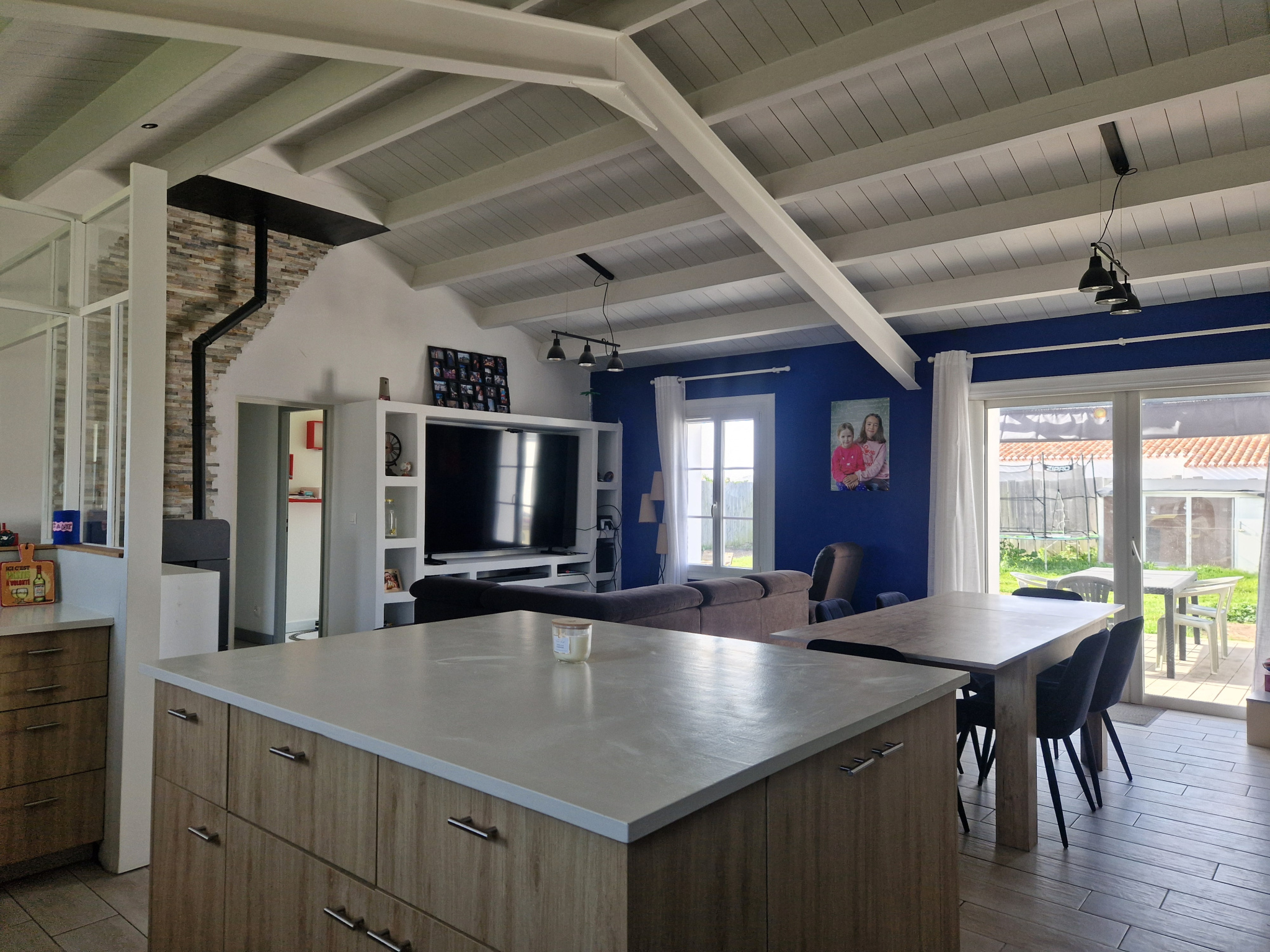 Belle pièce de vie avec cuisine aménagée, ilot central dissimulant une cave à vin, un couloir desservant 2 chambres, bureau, salle de bains et W.C. et buanderie.